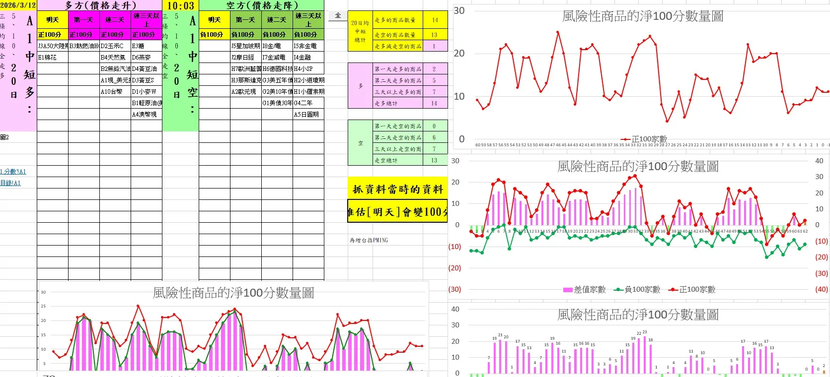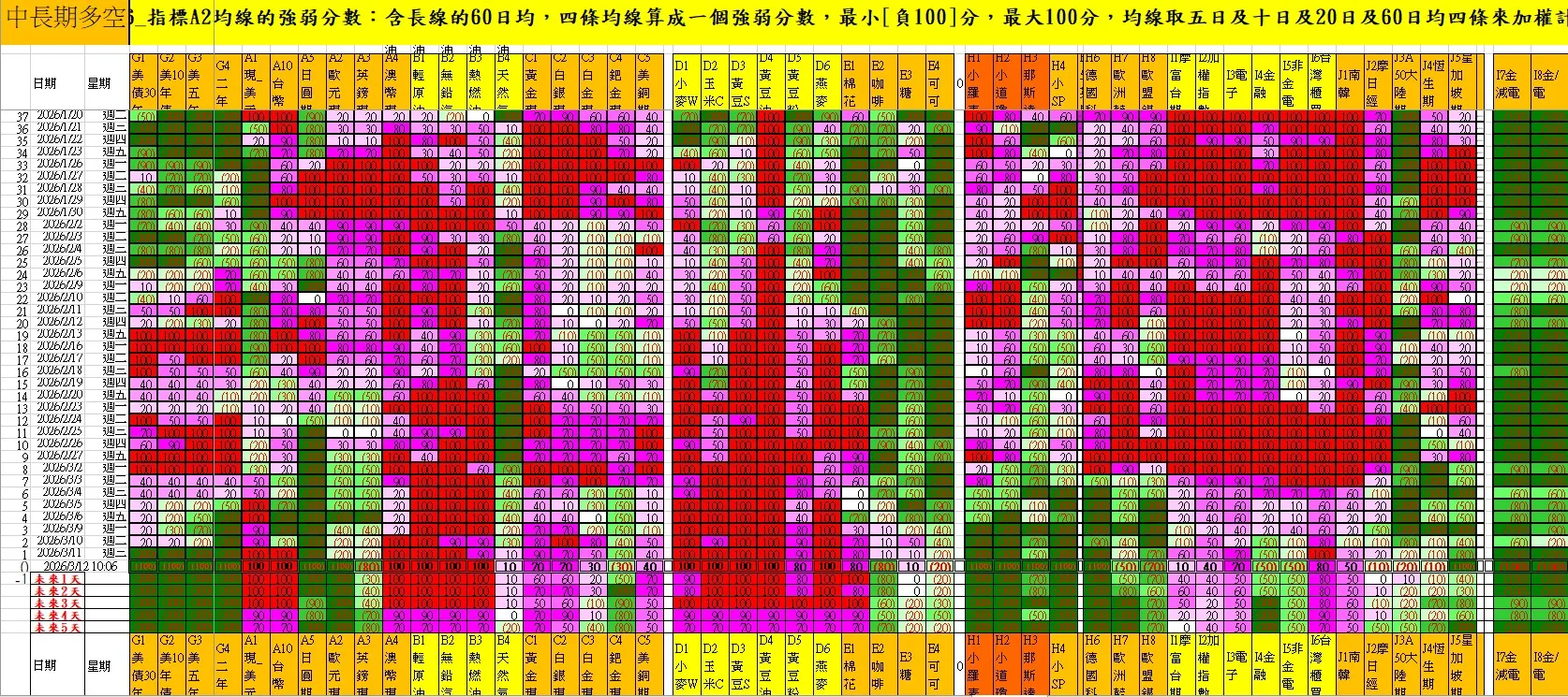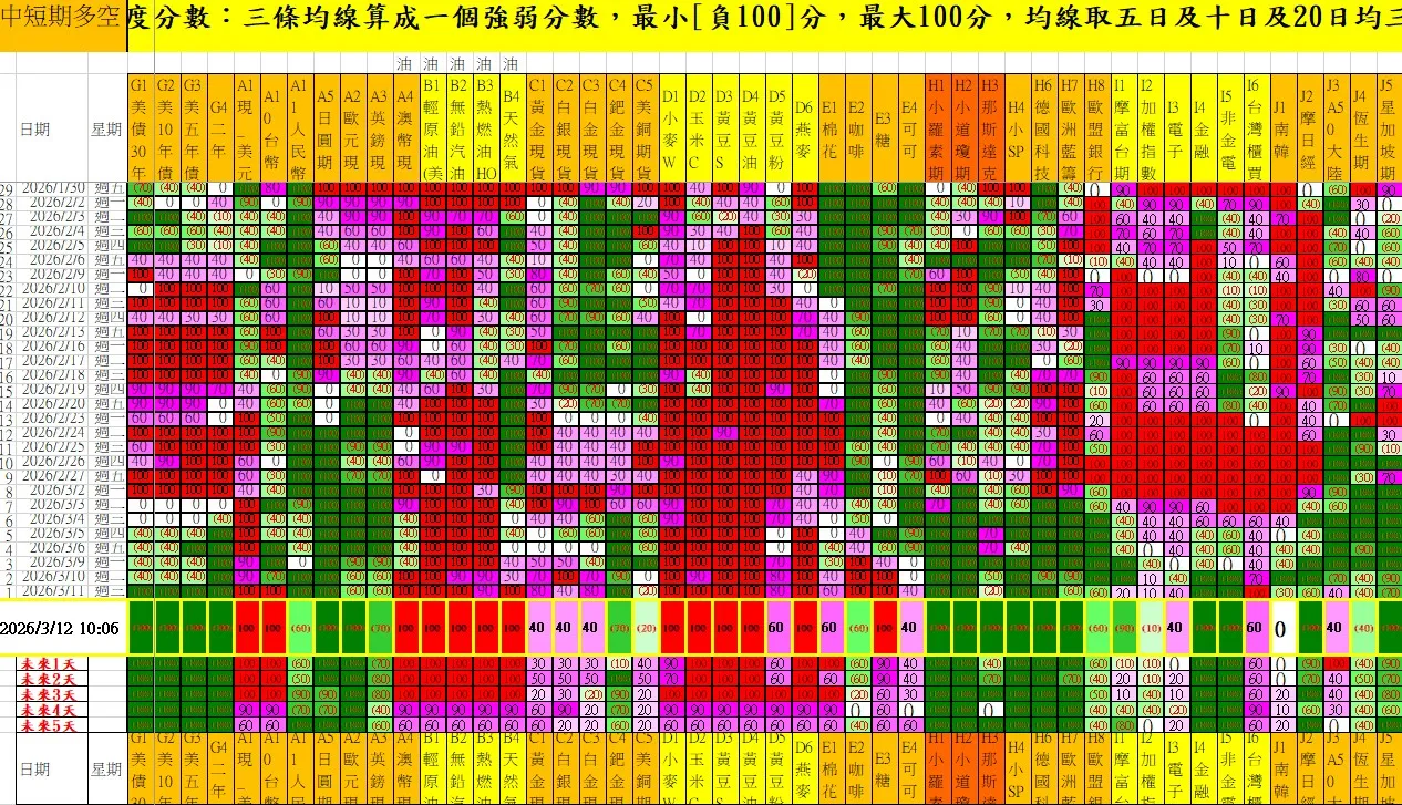 中長期趨勢: 納入 60日均線(季線)作為大方向依據。目前多空商品數量呈現 11 : 11 的勢均力敵態勢,市場處於高度分化階段。